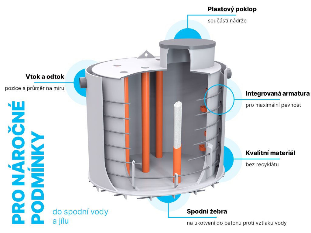 - Řešení pro náročné podmínky: Dvouplášťová jímka do spodní vody a jílu; po přebetonování pojezdová.