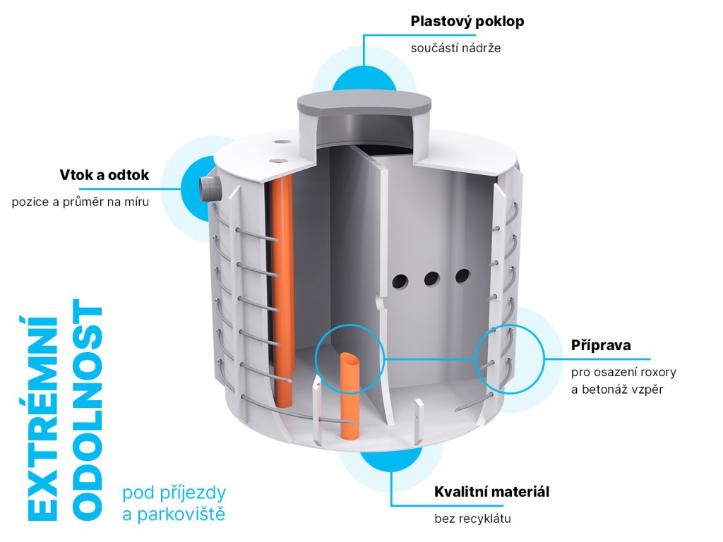 - Variabilní nosnost: Pojezdnost septiku je dána silou betonového skeletu. Při obetonování v tloušťce cca 15 cm je septik pojezdový osobním automobilem, při silnějším dimenzování betonu pak zvládne i pojezd těžkou technikou.