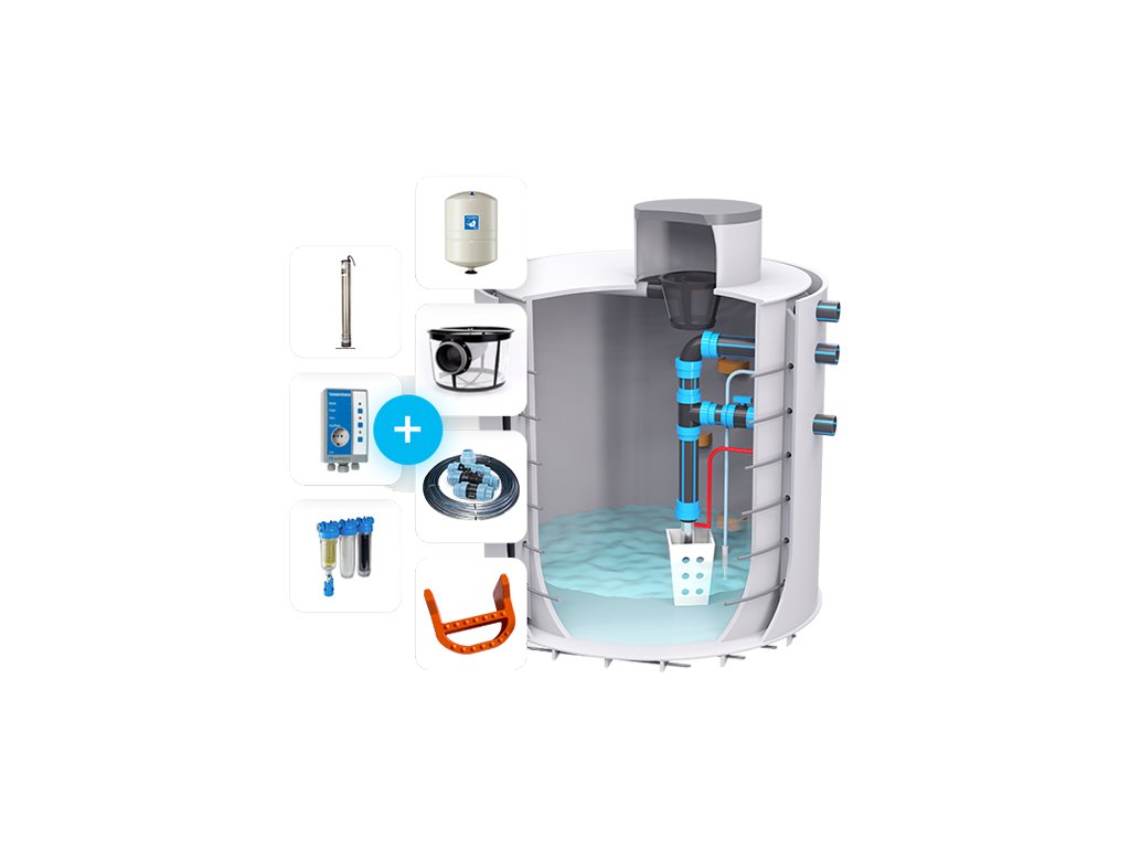 - Kompletní sestava do spodní vody (Dům i zahrada): Vystrojená nádrž (schůdky, držák) s automatickým čerpadlem, filtrací, filtračním košem a systémem pro automatické dopouštění vody.