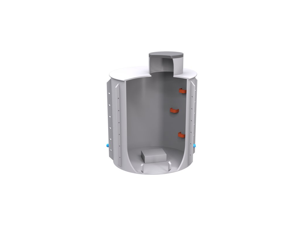 Vodoměrná šachta k obetonování je navržena pro instalaci do míst, kde je kladen důraz na vysokou statickou odolnost. Plastový skelet zde slouží jako vnitřní bednění a izolace, zatímco vnější betonový plášť přebírá veškeré zatížení okolní zeminy a tlaku na povrchu.